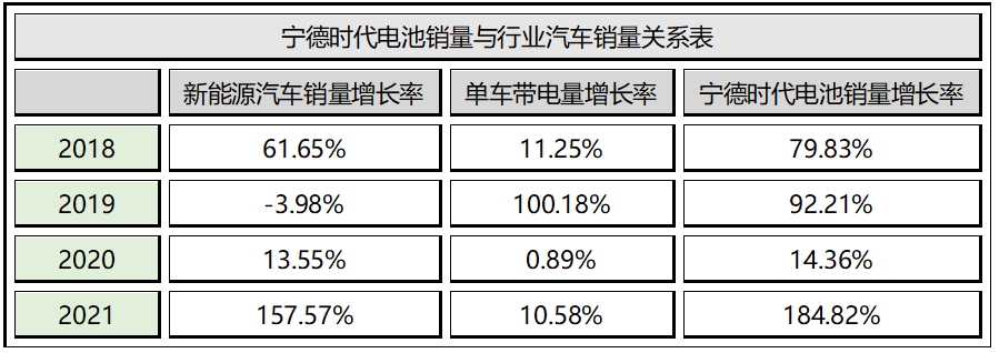在单车带电量没有突破时,宁德时代动力电池销量的增长与新能源车销量增长率近似相同。如果单车带电量取得技术突破时,宁德时代动力电池销量的增长率等于新能源车销量增长率与单车带电量增长率之和。
