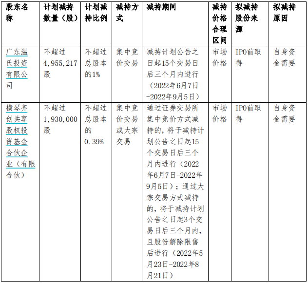 就在解禁前,三角防务这7位股东中已有两位股东提出减持计划。广东温氏投资有限公司计划在6月7日-9月5日减持不超过495.52万股,不超过总股本的1%;温氏投资一致行动人横琴齐创共享股权投资基金合伙企业(有限合伙)计划减持不超过193.00万股,占比不超过0.39%。