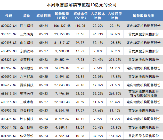 解禁市值超过10亿元的上市公司共计有14家,除四川路桥外,三角防务、山东路桥两家公司解禁市值各在80亿元左右。