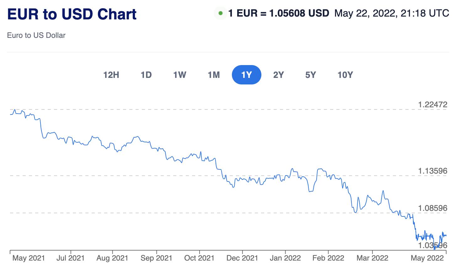 截至5月20日,在经历了连续一年的跌势之后,欧元兑美元汇率进一步跌至1欧元兑1.05美元。5月18日的汇率最低时一度达到1.035。