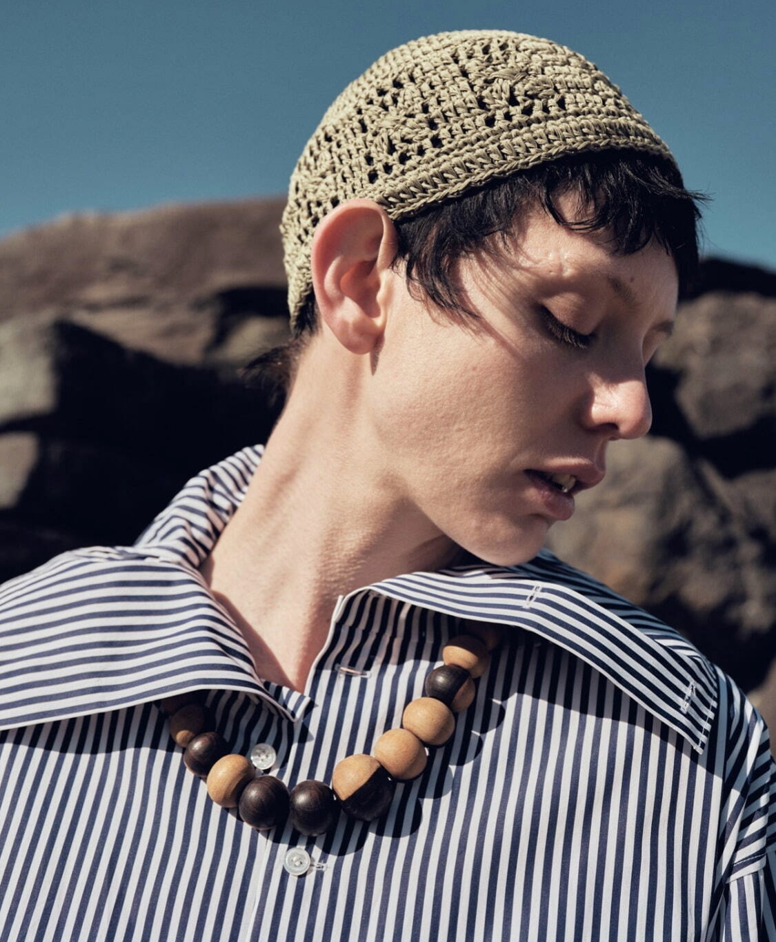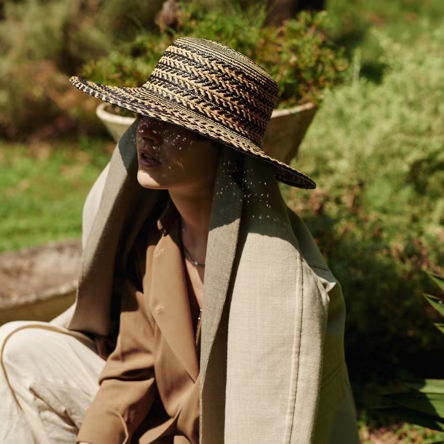 新作系列中以三款帽型贯穿始末,用天然材料手工编织的平顶帽子“TURO”,魅力在于拥有粗线条编织的凹凸感,显得纹理更加立体,交织着的黑色和软木色两个具有对比度的花纹十分漂亮。