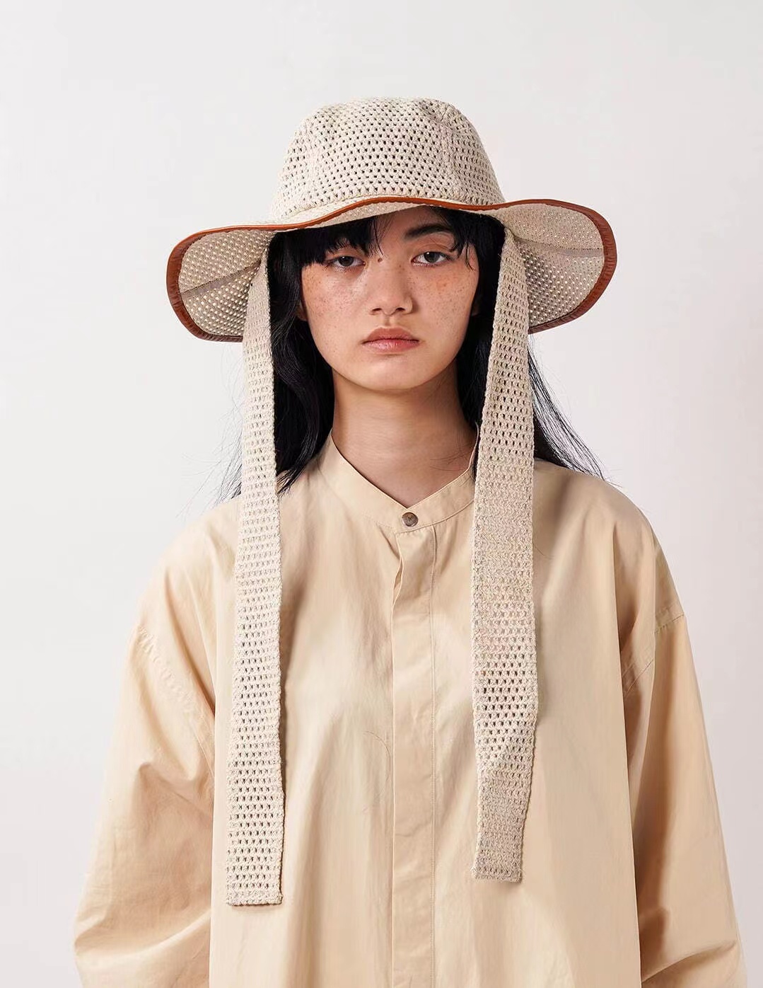第三款“OLEAF”是从军帽中获取灵感,两侧自然垂下的丝带,极具露营氛围,并使用棉亚麻的网状设计,考虑到夏季高气温因素,帽子没有添加额外的内衬,透气性良好。此外该款帽檐还可以弯曲变化,不失为一个凹造型的神器。