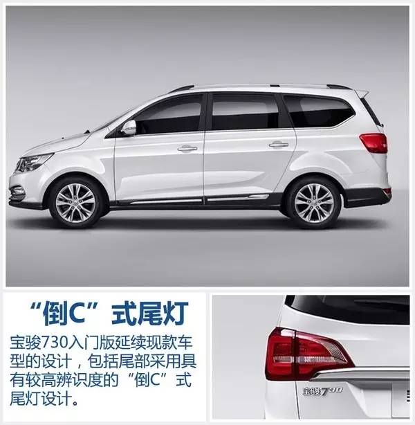 新车长宽高分别为4685*1785*1745毫米(1715不带行李架),轴距2750毫米。宝骏730入门版车型的车尾造型同样是注重在细节之处提升,后尾灯采用“倒C”式设计,超长镀铬装饰条与车尾灯相连,形成一个整体。顶部的LED高位刹车灯对于后方车辆增加警示作用。
