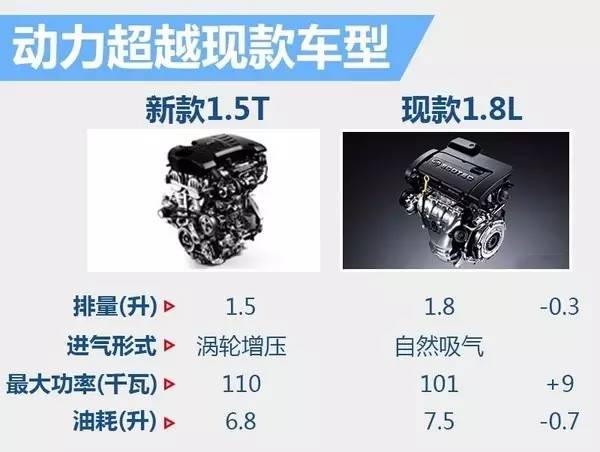 动力方面,新车将搭载一台全新1.5升直列四缸涡轮增压发动机,额定功率为103千瓦。通过与现款搭载1.5升与1.8升自然吸气车型对比后发现,新车得益于涡轮增压的帮助,相比1.5升车型功率提升了21千瓦,较1.8升车型提升了2千瓦。