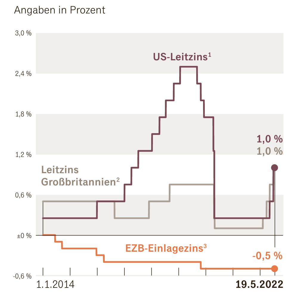 相比于欧洲央行姗姗来迟的加息预告,美联储已经于3月16日和5月4日两次分别加息25和50个基点,而英格兰银行更是已经连续四次加息,英国和美国的关键利率目前均为1%,已与欧元区关键利率出现了1.5%的利差。