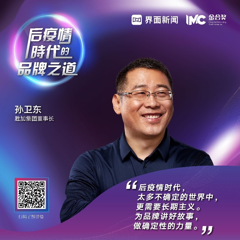 界面新闻金合奖组委会打造【后疫情时代的品牌之道】栏目,邀请胜加集团董事长孙卫东先生就后疫情时期,做好品牌营销的途径和策略进行了分析与探讨,他认为“后疫情时代,太多不确定的世界中,更需要长期主义。为品牌讲好故事,做确定性的力量”。