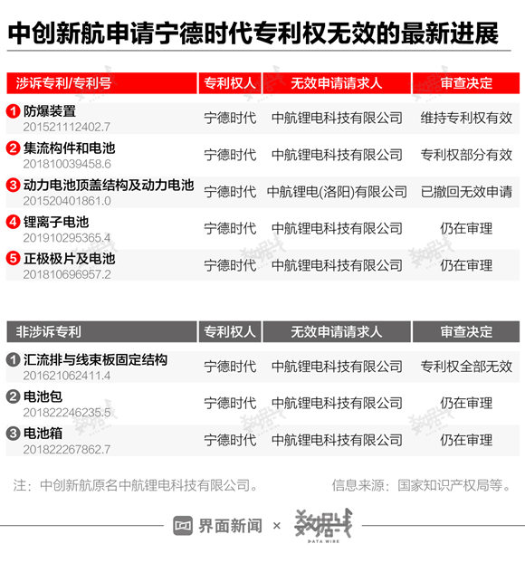 据界面新闻统计,中创新航在向国家知识产权局提起五件涉诉专利无效请求的同时,还提交了另外三件宁德时代专利的无效申请。但这三件专利与两家公司目前的专利权纠纷案无关。