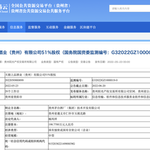 5月23日, 界面记者从贵州阳光产权交易所有限公司官网、贵州省公共资源交易云网站获悉,贵州茅台酒厂(集团)技术开发有限公司 (以下简称“茅台技开公司”)将转让天朝上品酒业(贵州)有限公司(以下简称“天朝上品酒业”)51%股权。