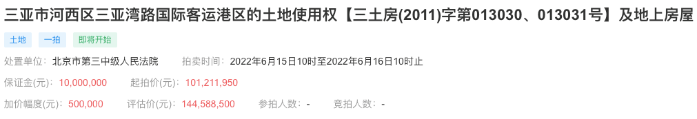 该起拍卖所属的司法案件为三亚凤凰岛国际邮轮港与西藏信托有限公司金融借款合同纠纷案件,案号为(2018)京民初19号;以及源于5月10日三亚凤凰岛国际邮轮港新增的一则被执行人信息,其案号为(2022)京03执恢158号,执行标的为90000万元。