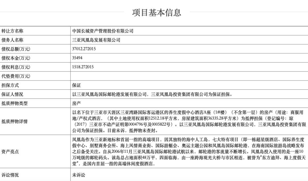 而就在月前,北京产权交易所发布了一则名为【CP2022BJ1002187】三亚凤凰岛发展有限公司债权资产转让【文旅产业】信息,转让方为中国长城资产管理股份有限公司,债务人为三亚凤凰岛发展有限公司,债权总额为37012.272015万元(其中债权本金为35494万元,债权利息为1518.272015万元),以名下位于三亚市天涯区三亚湾路国际客运港区的养生度假中心酒店A座(1#楼)(不含第一层)的房产(用途:商服用地/产权式酒店,(其中土地使用权面积12512.18平方米,房屋建筑面积36335.28平方米)为抵押担保(登记编号:琼(2017)三亚市不动产证明第0004796号及0005822号)。以三亚凤凰岛国际邮轮港发展有限公司,三亚凤凰岛投资集团有限公司为保证担保。披露起始日期为2022年4月19日至2022年10月15日。