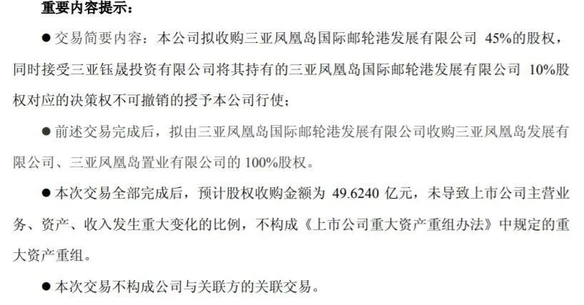2014年3月,中国交建以50亿元收购了三亚凤凰岛国际邮轮港45%的股权,同时钰晟投资对三亚邮轮港10%的决策权不可撤销的授予中交行使,二者成为一致行动人。由此,中国交建成为了凤凰岛新的控制人。据三亚凤凰岛官网显示,收购完成后,中国交建后期陆续投资预计200亿元滚动开发三亚凤凰岛后续项目。