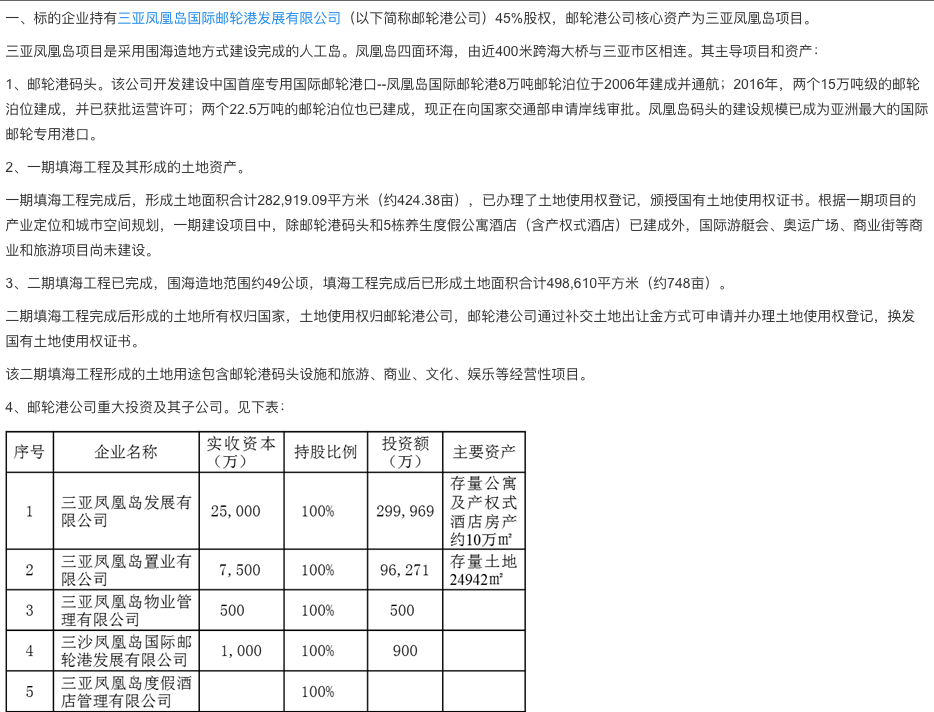 彼时的转让信息显示,三亚凤凰岛项目的资产主要是邮轮港和填海工程及其土地资产,具体包括已经建成并通航的8万吨邮轮泊位、已获批运营的两个15万吨邮轮泊位和已建成正在审批中的两个22.5万吨的邮轮泊位,一期填岛新城的土地28.3万平方米和二期填岛形成的土地49.9万平方米,以及凤凰岛发展、凤凰岛置业、凤凰岛物业管理、三沙凤凰岛国际邮轮港、凤凰岛度假酒店等附属公司、股权投资。