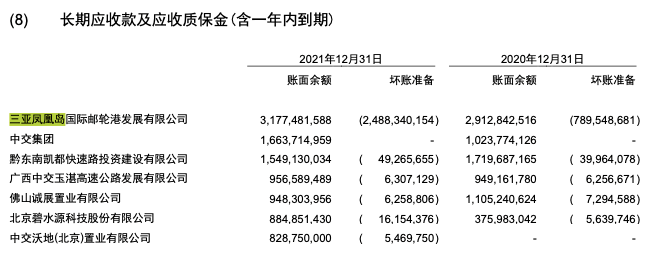根据中国交建2021年年度报告,截至2021年12月31日,公司所拥有的三亚凤凰岛国际邮轮港长期应收款及应收质保金(含1年内到期)账面余额高达31.77亿元,其中坏账准备为24.88亿元,较去年同期的7.89亿元,暴增近17亿元。