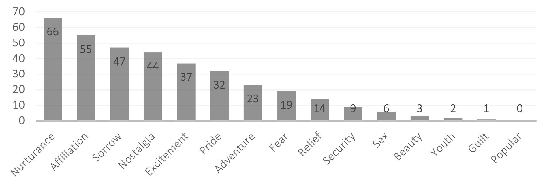 研究团队先是根据理论框架将广告的情绪划分为16类,然后对疫情期间的广告一个个进行内容评估,最后发现有77%的广告使用了积极的情绪,21%的广告同时使用了积极和消极情绪,仅7%只在广告作品中使用了消极情绪。整体来看,使用频率最高的情绪为关爱(Nurturance)、亲和(Affiliation)、悲伤(Sorrow)、怀旧(Nostalgia)、兴奋(Excitement)、自豪(Pride)。