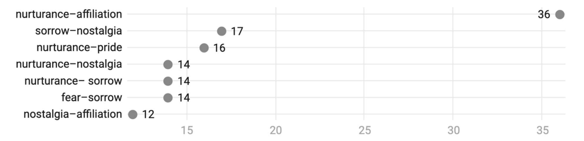 从广告作品的情绪数量来看,在单一广告中同时使用两种情绪的情况最为常见,首选的情绪搭配组合是“关爱-亲和”,其次是“悲伤-怀旧”、“关爱-自豪”、“关爱-怀旧”、“关爱-悲伤”、“恐惧-悲伤”、“怀旧-亲和”。