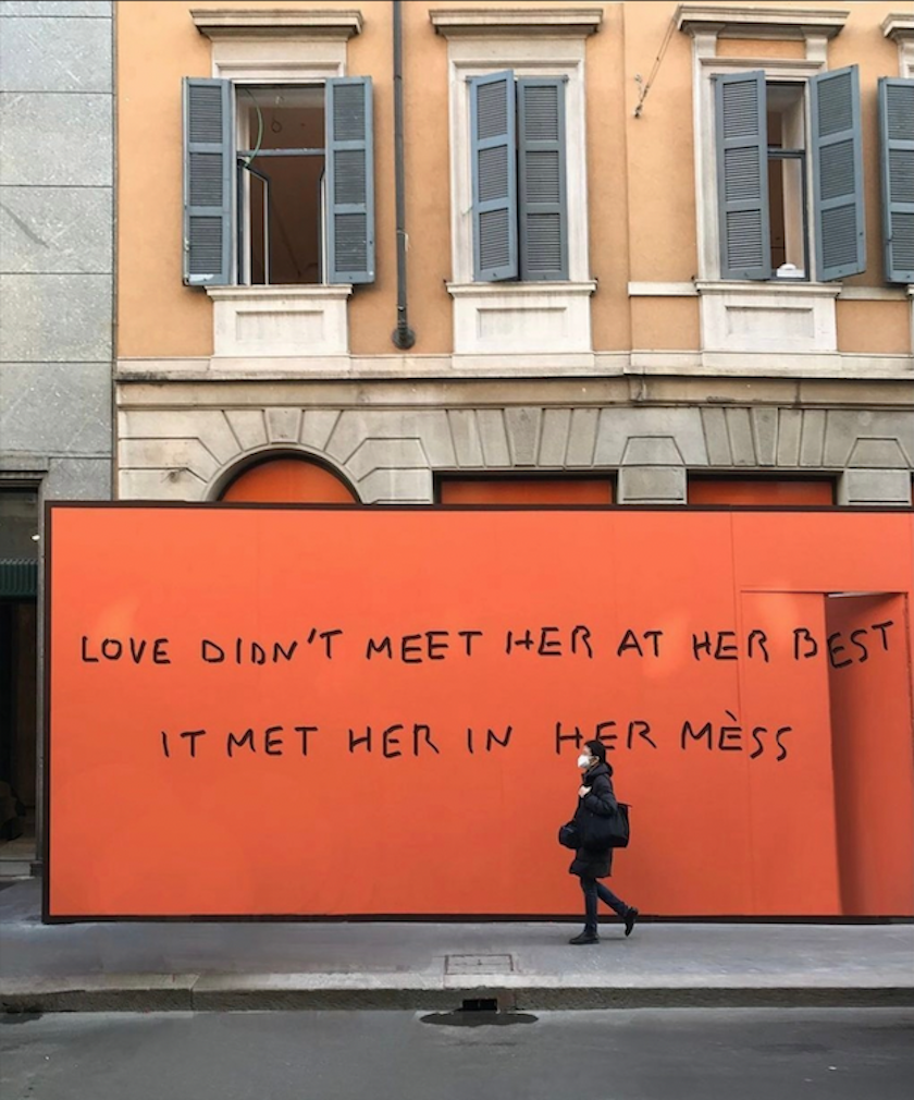 品牌标志性的橙色背景上空无一物,仅写着一句Love didn't meet her at her best, it met her in her mess,可以被翻译为:真爱往往不会发生在你最得意时,而是在你狼狈不堪时降临。这是爱马仕此前在意大利米兰Via della Spiga门店的围挡,由艺术家Pietro Terzini设计,将爱马仕的Hermès拆成了her mess。这个作品在2021年一度成为社交媒体的热议话题。