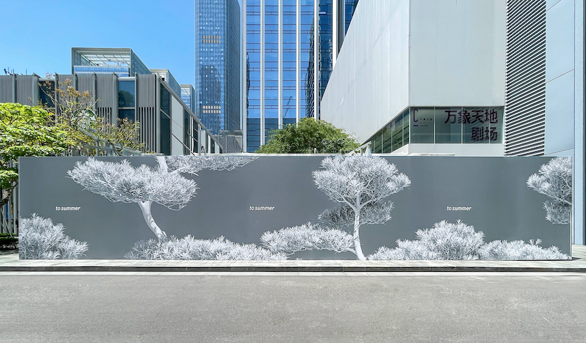 主打香薰类产品的新锐品牌观夏,在打造位于深圳万象天地的华南首店时,便以东方庭院为主题进行围挡设计,在一众高楼大厦间用白皑的枝叶和一句简单的to summer来凸显其闲适、艺术性的一面。