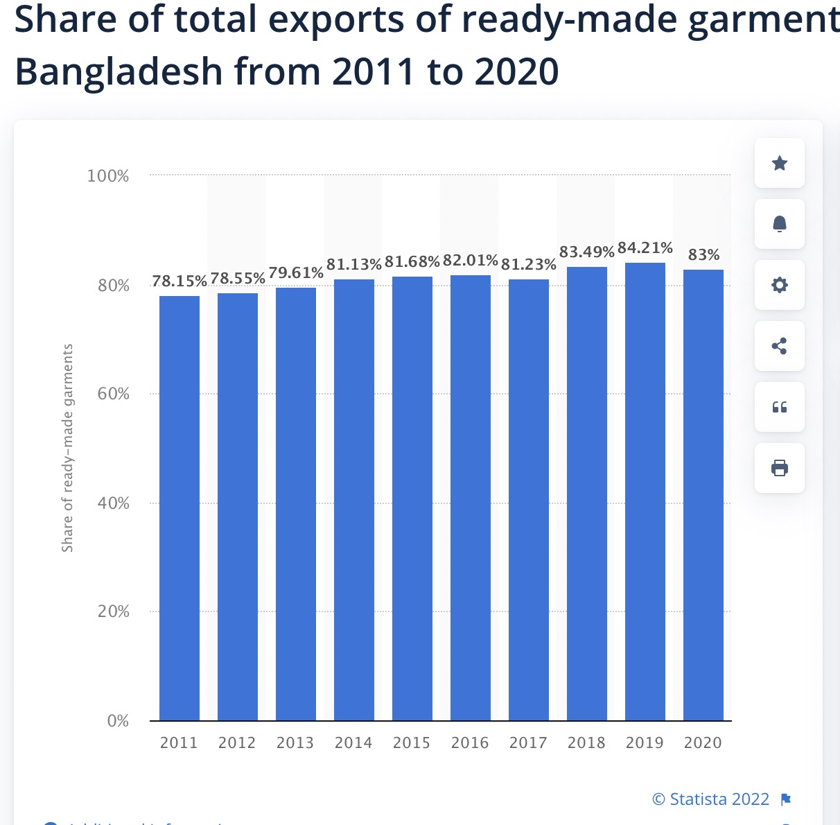 梭织和针织服装及服装配饰的出口总额占孟加拉国出口总额(433.44亿美元)的81.58%。