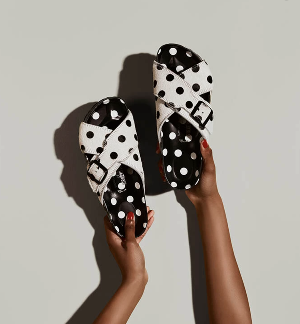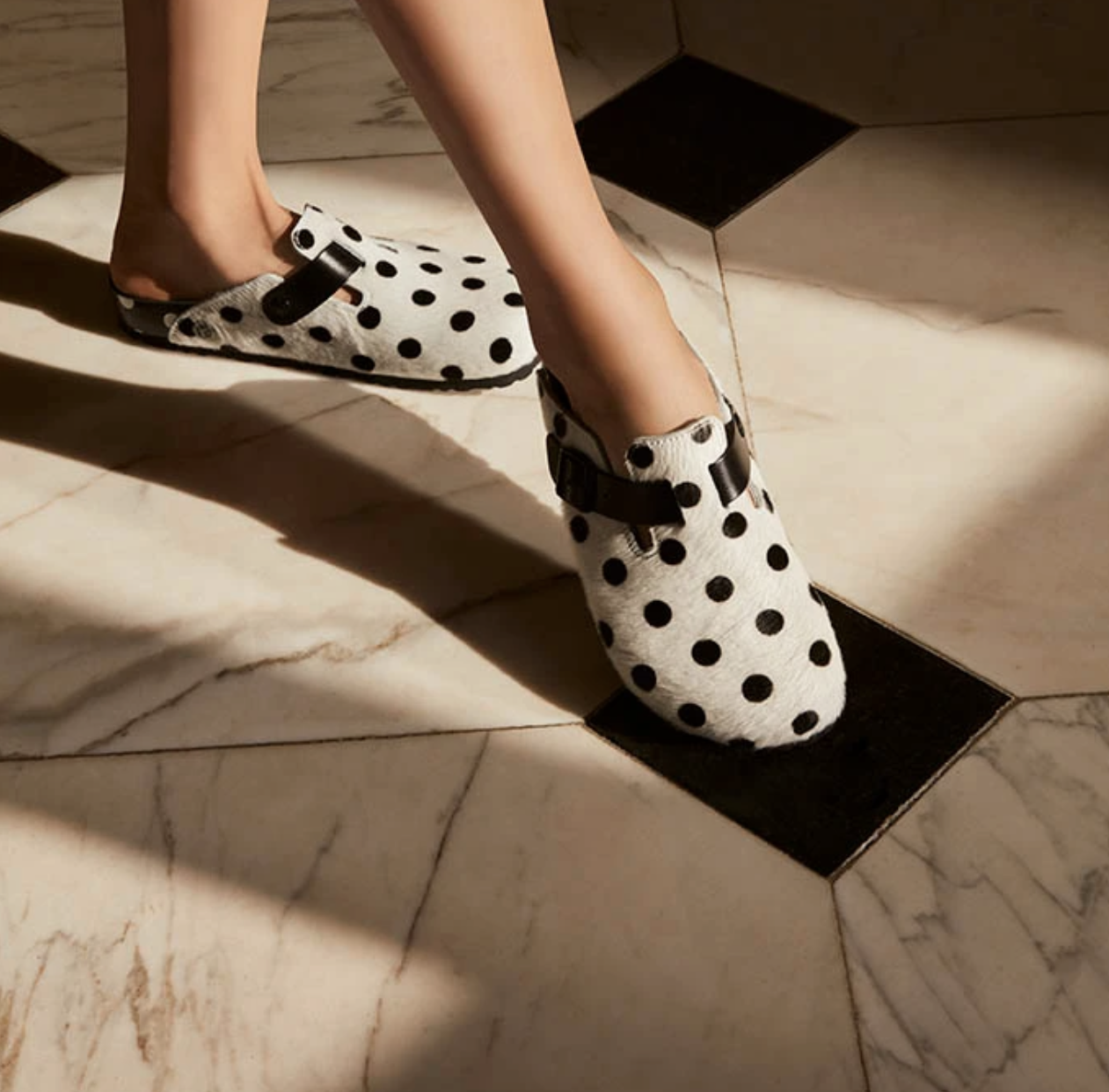 此次联名系列依旧围绕Arizona和Boston两款鞋型展开,Arizona以透明水晶扣为特色;Boston则以黑白波点天鹅绒版本呈现;平行扣的PVC是充满夏季氛围的材质。另外本次联名系列还包括全面波点款式:小牛毛Rodra波尔卡圆点凉鞋和小牛毛Boston木底穆勒鞋。赶快为双脚增添一抹凉爽又不易过时的经典凉鞋,舒舒服服过一“夏”。