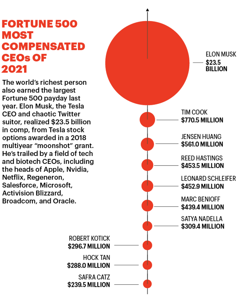 即使考虑到他们是世界最负盛名公司的CEO,这些人的薪水也实在高得惊人。《财富》杂志最近统计了2021年280位世界500强CEO的薪酬,中位数就达到了1590万美元。