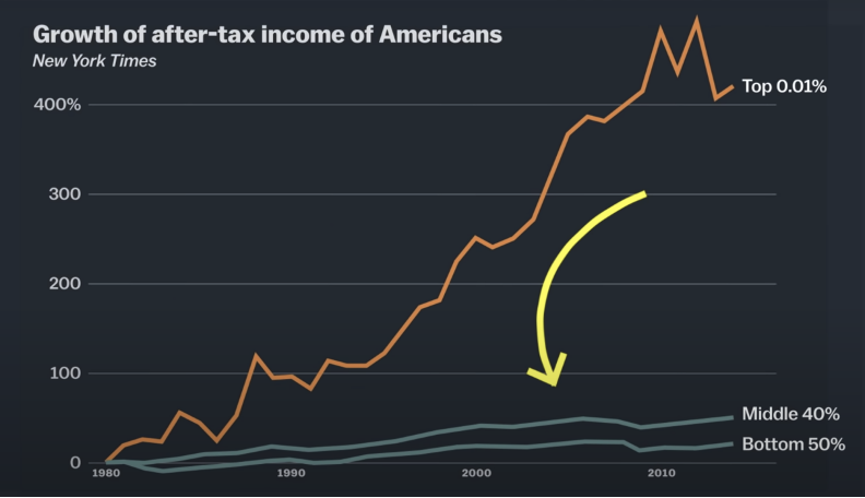 自1980年代以来,美国最有钱的那0.01%的税后收入增长了400%,而中产阶级们仅仅增长了50%。|图片来源:纽约时报