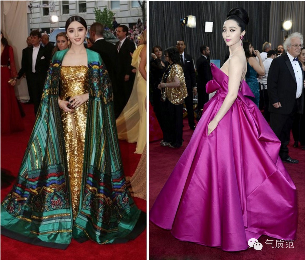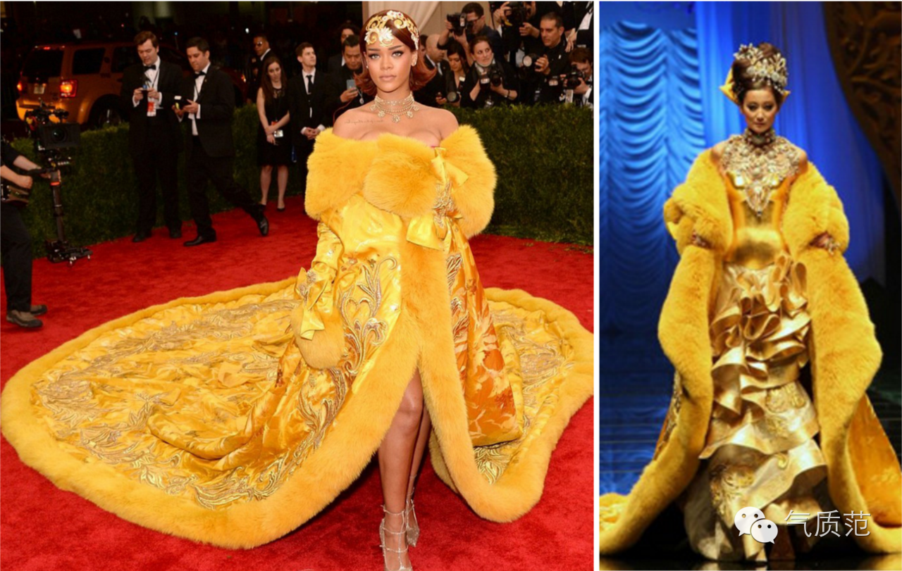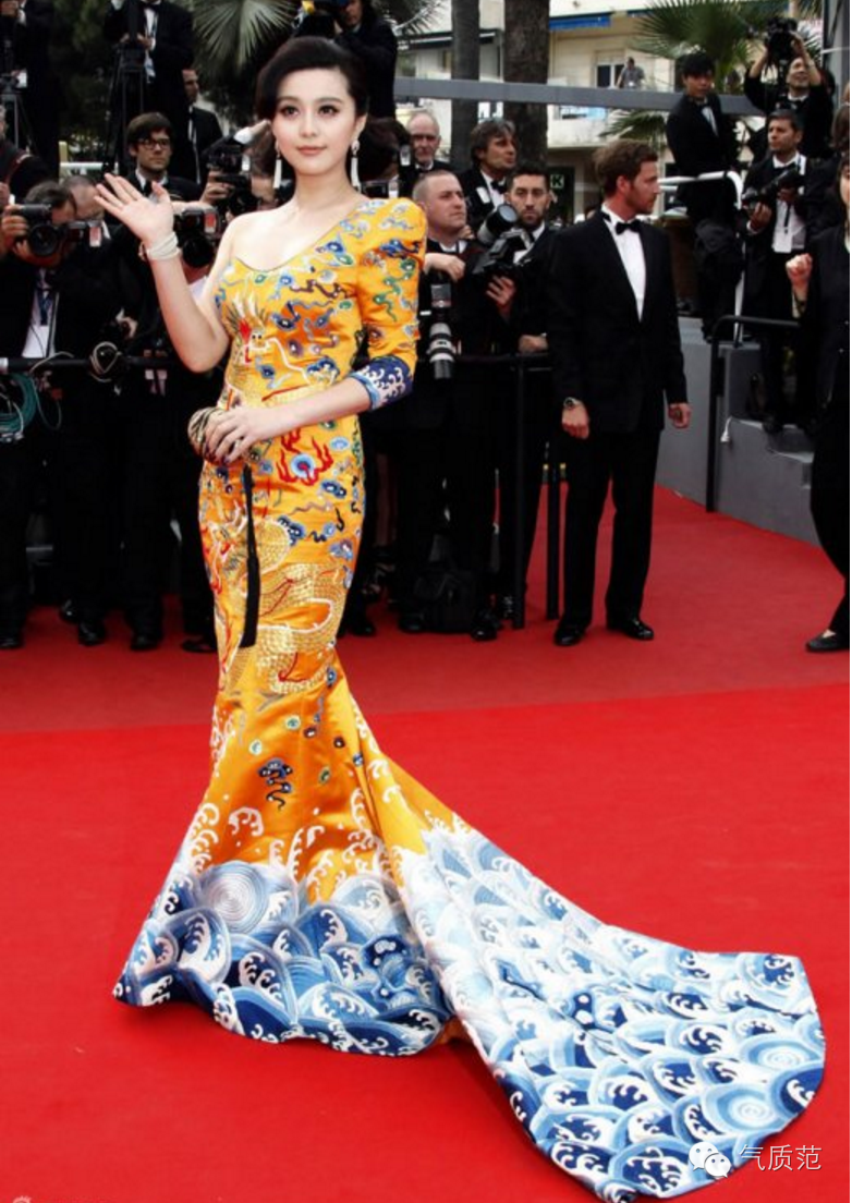 卜柯文很了解范冰冰的身材优势,不但做到了扬长避短,还穿出了范爷的风格和气场。比如这条龙袍,就不是谁都能穿的,西方的RIRI想模仿范爷的黄袍装,结果把自己穿成了平底锅上的鸡蛋饼……