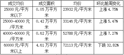 上周在商品住宅成交面积上,不同价位的房源成交面积均上涨,其中,相较于前周,每个价位区间的商品住宅成交面积上涨至少达到4倍以上,可见,目前,上海在复工复产政策下的楼市正逐步走向正常的步伐。就均价而言,以4月份整月的均价为基准,均价仍然处于上涨趋势。