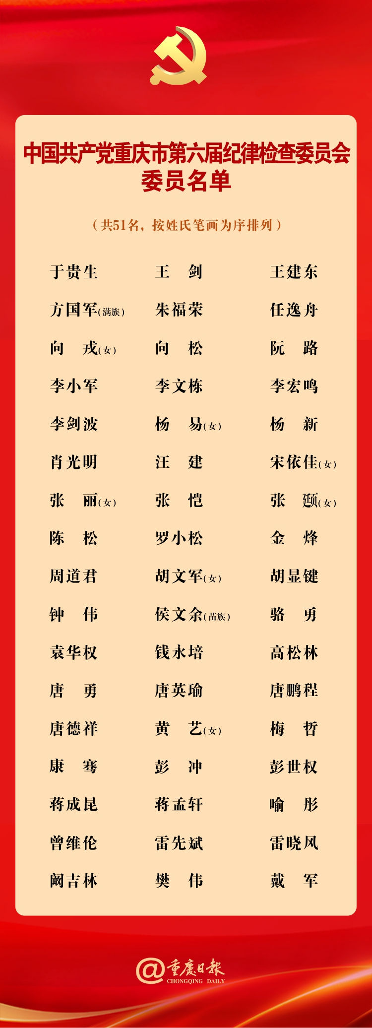 新一届重庆市委委员、候补委员,市纪委委员名单