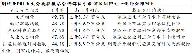 覆盖了制造业、服务业、建筑业的综合PMI产出指数明显上升。5月份,综合PMI产出指数录得48.4%,较4月份上升5.7个百分点。其中,制造业采购经理指数(PMI)为49.6%,虽低于50%荣枯线,但比上月上升2.2个百分点。