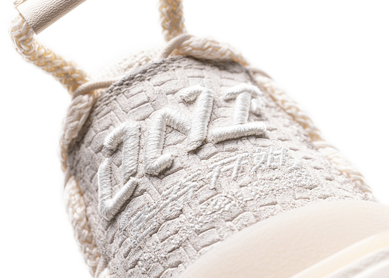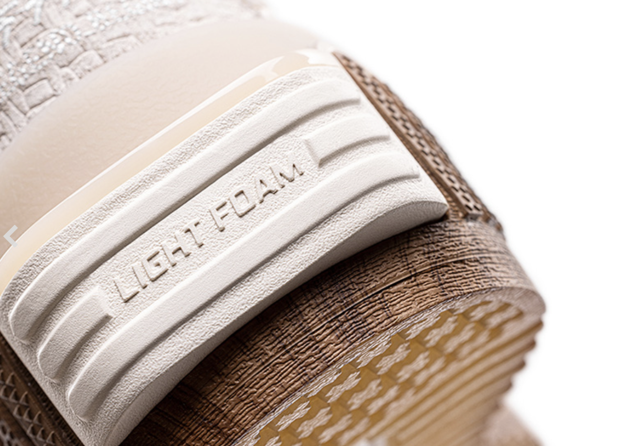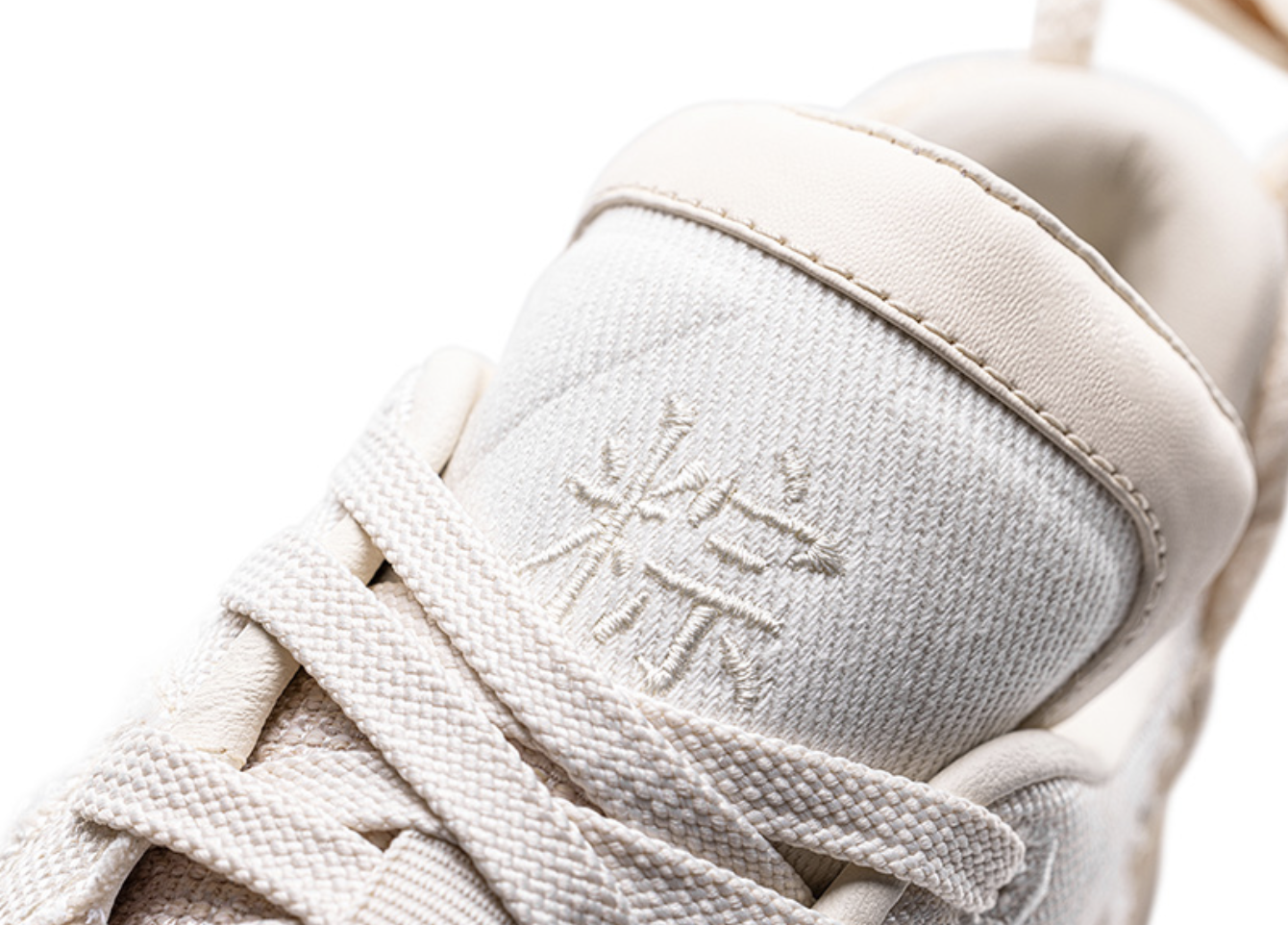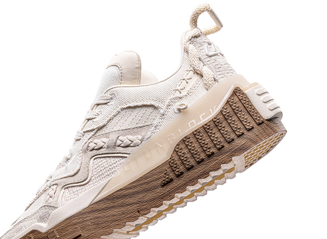 剥开“粽叶”后,“内馅”露出,米白色的鞋身正好对应软糯香甜的糯米,采用富有纹理的木质棕色为鞋底设计,分布于鞋两侧轮廓的编织麻绳为鞋子增添了一抹民族风情,呈现潮流与传统的交织。此外,鞋舌上也印有“粽”字样,突出节日氛围;鞋后跟处则添加类似米粒形状的压花纹路。