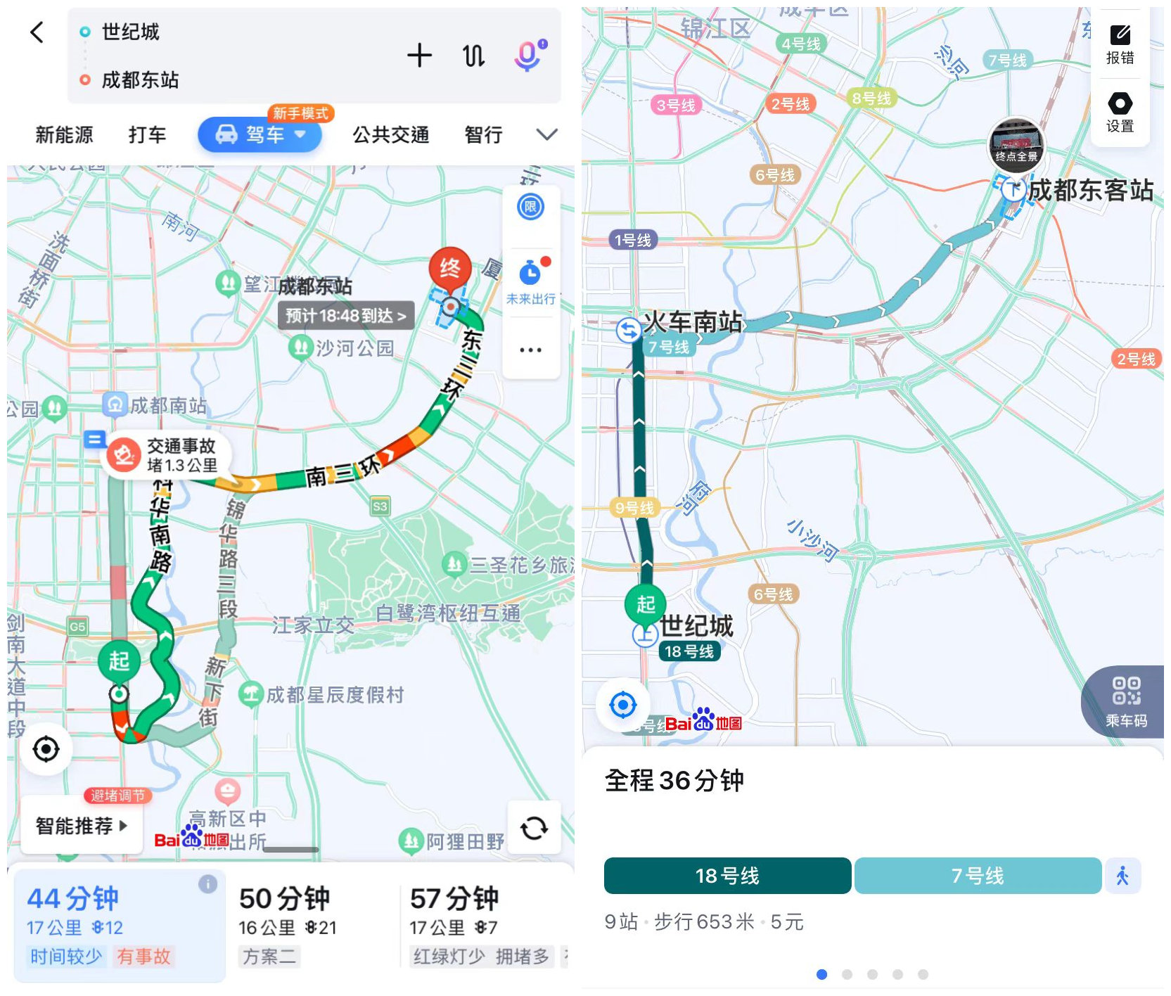高新区以世纪城地铁站为例,前往成都东站路程约17km,高峰时段驾车最快约44分钟,搭乘地铁最快36分钟,加上前往地铁站及进站时间,需要预留近1小时出行时间。