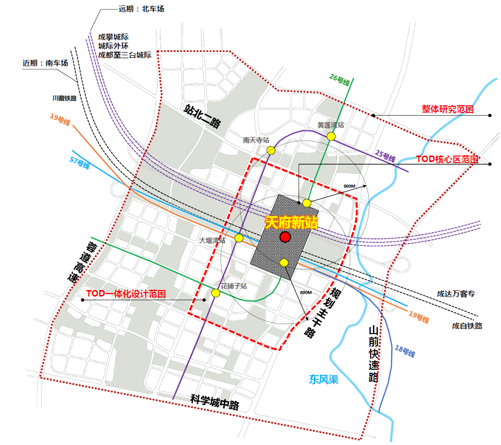 据了解,天府新站TOD内通过的城市轨道交通线路有18、19、25、26、S7号线,也是四个主站(成都站、成都东站、天府新站、东部新城站)中轨道换乘最便捷及双机场零换乘的铁路站点。