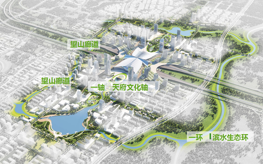天府新站TOD项目的一体化城市设计范围达到了4080亩,远远超过其他TOD项目,在设计上充分贯彻公园城市发展理念,依托蓝绿资源,构建全域化的多级公园体系,规划形成“一核、一环、两廊、一轴、六组团”的生态格局。