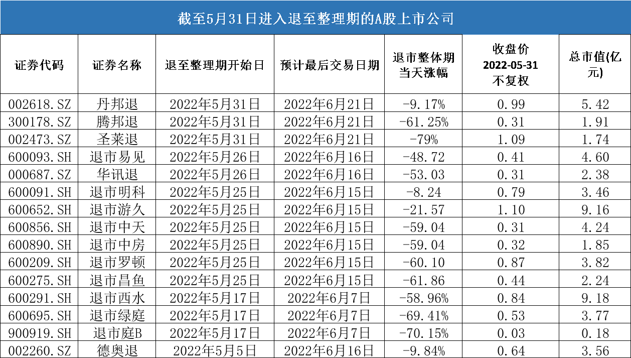进入退市整理其的首个交易日,股价无价格涨跌幅限制,此后每日涨跌幅限制为10%。受此影响。在退市整理期首日公司股价多严重下挫。比如在5月31日,圣莱退(002473.SZ)收盘报1.09元,跌幅达79%;腾邦退(300178.SZ)收盘报0.31元,跌幅达61.25%。