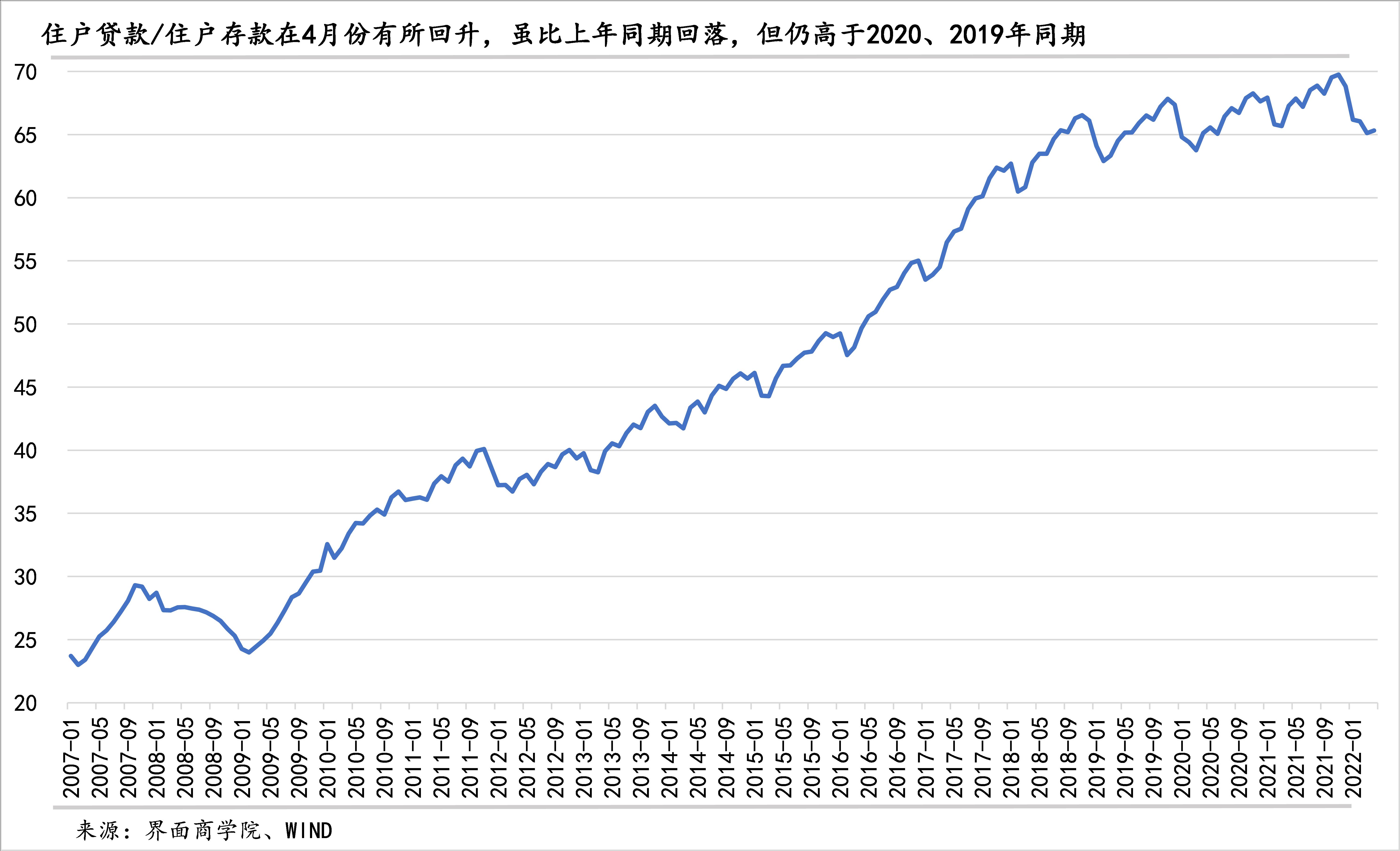 目前来看,上述住户贷款/住户存款的微幅回调,短期内还难形成趋势。一方面,存款的增加,有疫情冲击下社会消费被动减少的原因。今年3、4月份,社会消费品零售总额环同比均出现负增长,1-4月累计同比增速由正转负(-0.2%)。如果以2021年1-4月社会消费品零售总额累计值138373亿元、累计同比增速按照疫情前2019年增长8%作为2022年前四个月的正常消费,那么前四个月少消费逾1.1万亿元。扣除这一因素后,住户贷款/住户存款会有所上升。