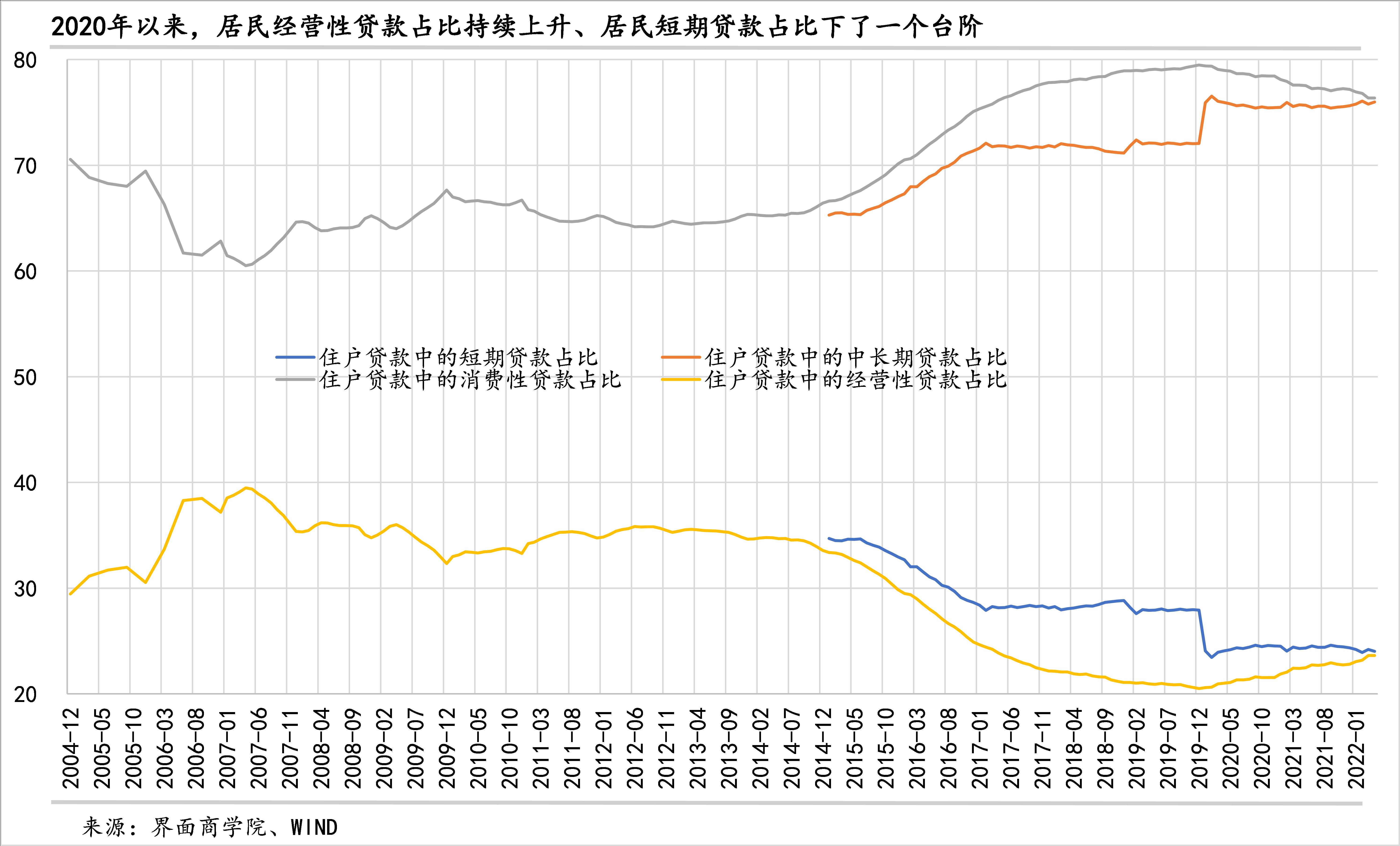 从贷款用途看,2020年以来,经营性贷款增速显著加快,尽管随着治理经营贷变房贷的现象后,经营贷增速放缓,但仍显著快于住户贷款和消费贷款,由此推动住户贷款中的经营性贷款比重持续上升、消费性贷款的比重持续下降,特别是短期贷款中经营贷的比例上涨幅度更大,今年4月份已经比疫情前高出12.5个百分点。