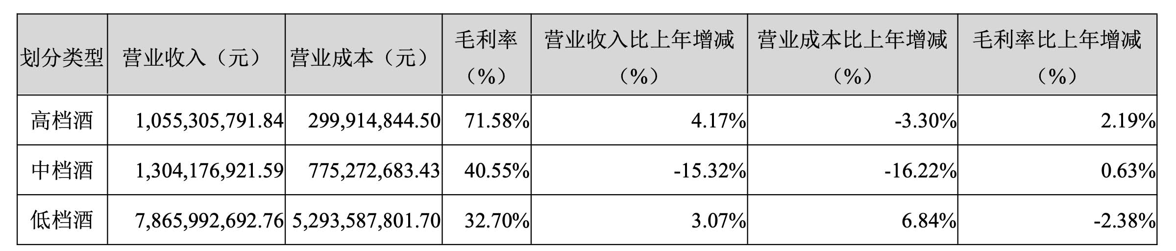 不仅仅是泸州老窖,作为依靠低端产品冲入百亿阵营的牛栏山,也不能逃过低毛利率的“梦魇”。根据牛栏山母公司顺鑫农业2021年财报显示,低档酒(低于10元/500ml)以及中档酒(10元-50元/500ml)营收均远远高于高档酒(高于50元/500ml),但对比毛利率而言,高档酒近72%的毛利率是中档酒的1.77倍,更是远超低档酒毛利率2.19倍。
