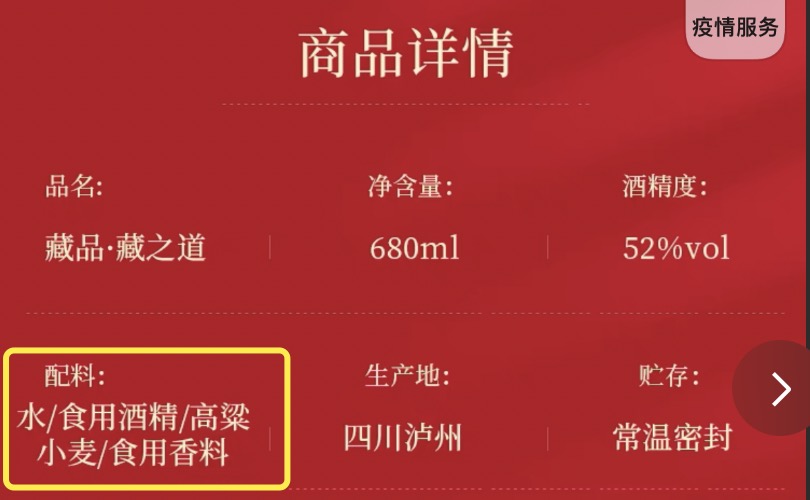 除牛栏山外,泸州老窖旗下藏品系列藏之道、共赏、喜装等配料均含有“食用酒精、食用香料”等成分。对此,知情人士向界面记者表示,目前,该产品已停产。另外,因上述产品并不涉及食品安全问题,所以会让终端自动消化处理完库存。除此,泸州老窖还会对黑盖二曲进行升级调整。