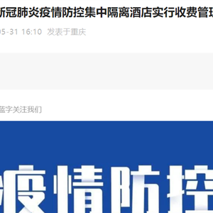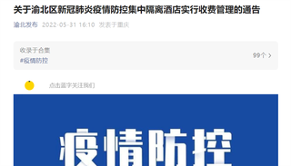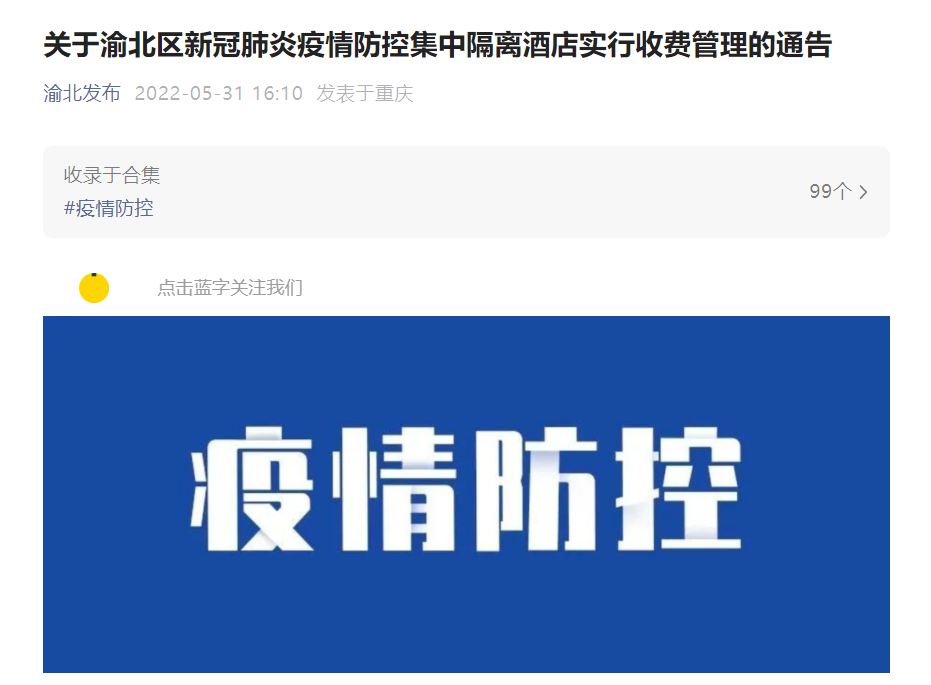 重庆市渝北区新型冠状病毒肺炎疫情防控工作指挥部昨日发布通告,对在渝北区集中隔离酒店隔离管控的人员收取食宿费用,自2022年6月1日起开始执行。