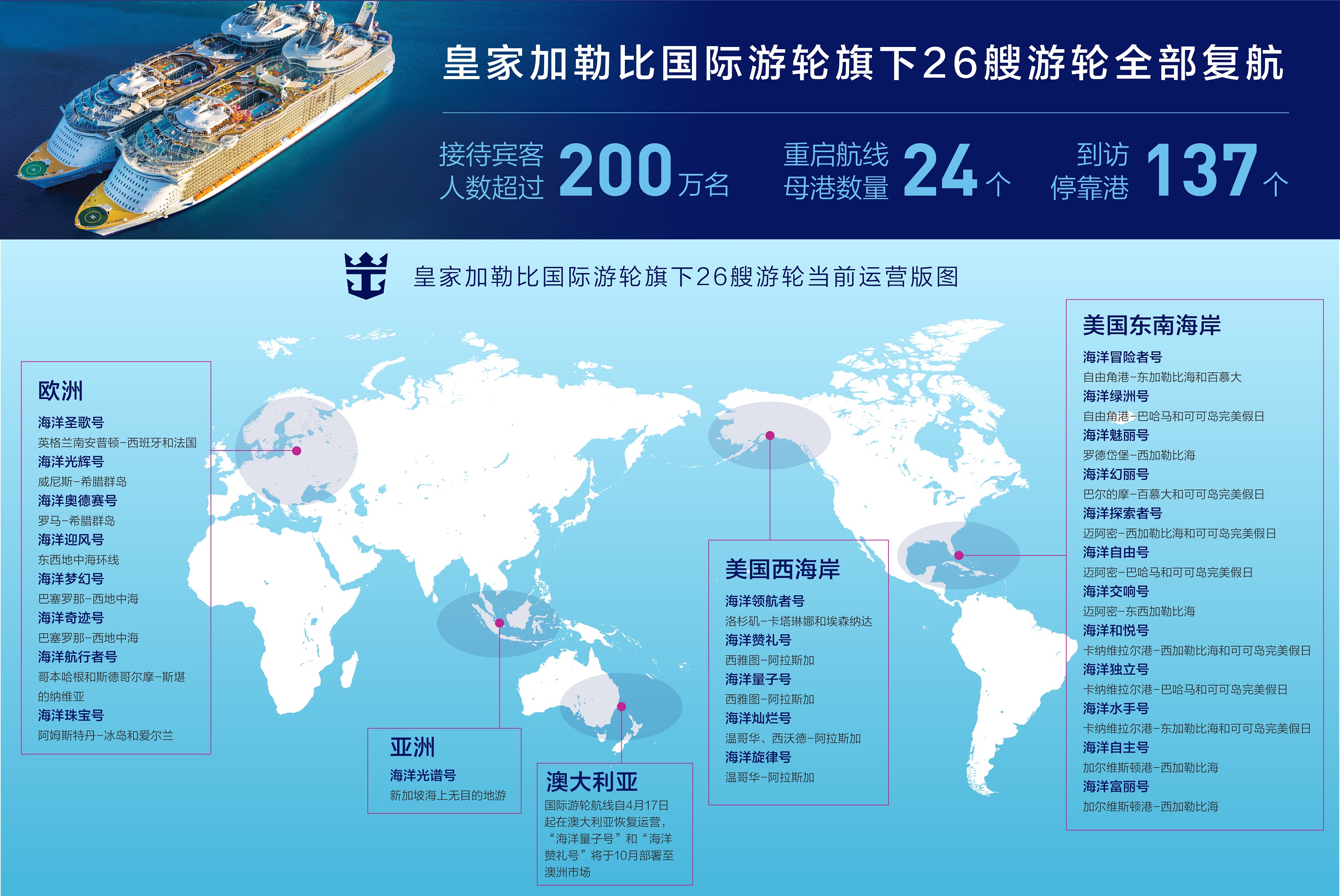 5月23日,皇家加勒比国际游轮旗下最后一艘复航游轮“海洋迎风号”(Rhapsody of the Seas)顺利从意大利罗马驶出,开启前往希腊群岛的旅程。至此,皇家加勒比旗下26艘游轮全部复航。自2020年12月旗下首艘复航游轮 “海洋量子号” (Quantum of the Seas)在新加坡恢复运营至今,皇家加勒比游轮已在全球24个母港重启航线,到访了137个停靠港,接待超过200万名宾客。