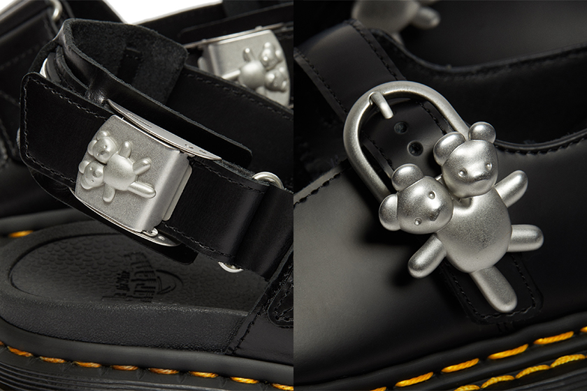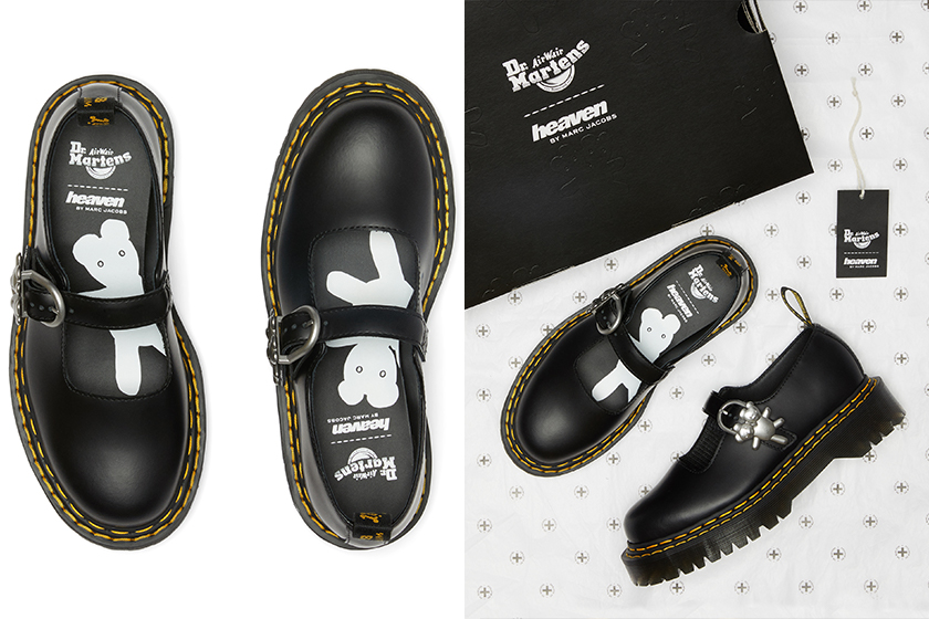 2021年Heaven就曾与Dr.Martens合作打造了高帮90年代风格鞋款,而2022年5月,双方再次合体,以Dr.Martens的两款经典鞋型Mary Jane和Ricki涼鞋为基础,融入90年代俏皮反叛女性气质,以银色Heaven双头泰迪熊点缀于搭扣,黑色主调突出展现着双头泰迪熊的可爱,鞋后方点缀Dr.Martens亮黄色帆布标识,体现联乘含义。