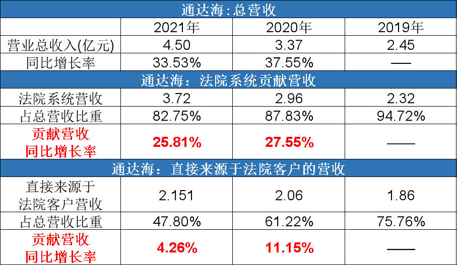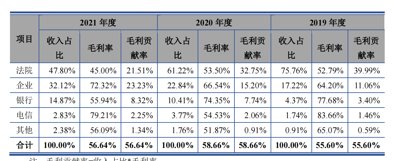 - 其中,2019年、2020年和2021年直接来源于法院客户的收入占主营业务收入的比例分别为 75.76%、61.22%及 47.80%。