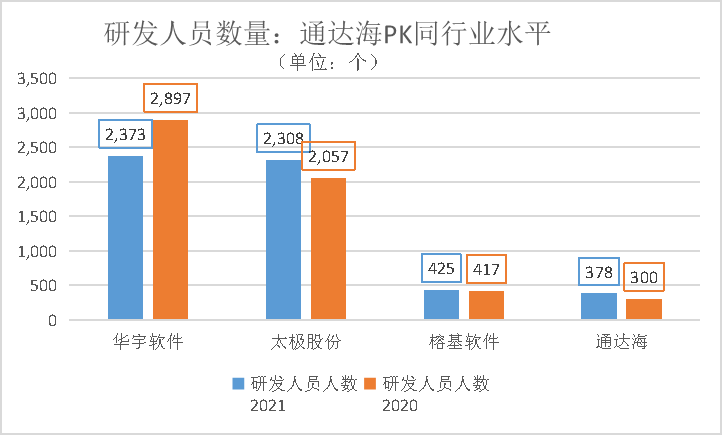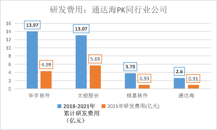 2021年通达海研发人员不足380人,同行业公司华宇软件和太极股份这一数字均超2300人。在研发费用上,2018年至2021年4年时间,通达海花费仅为2.6亿元,同行业其他3家公司累计花费在3.8亿元至14亿元之间。