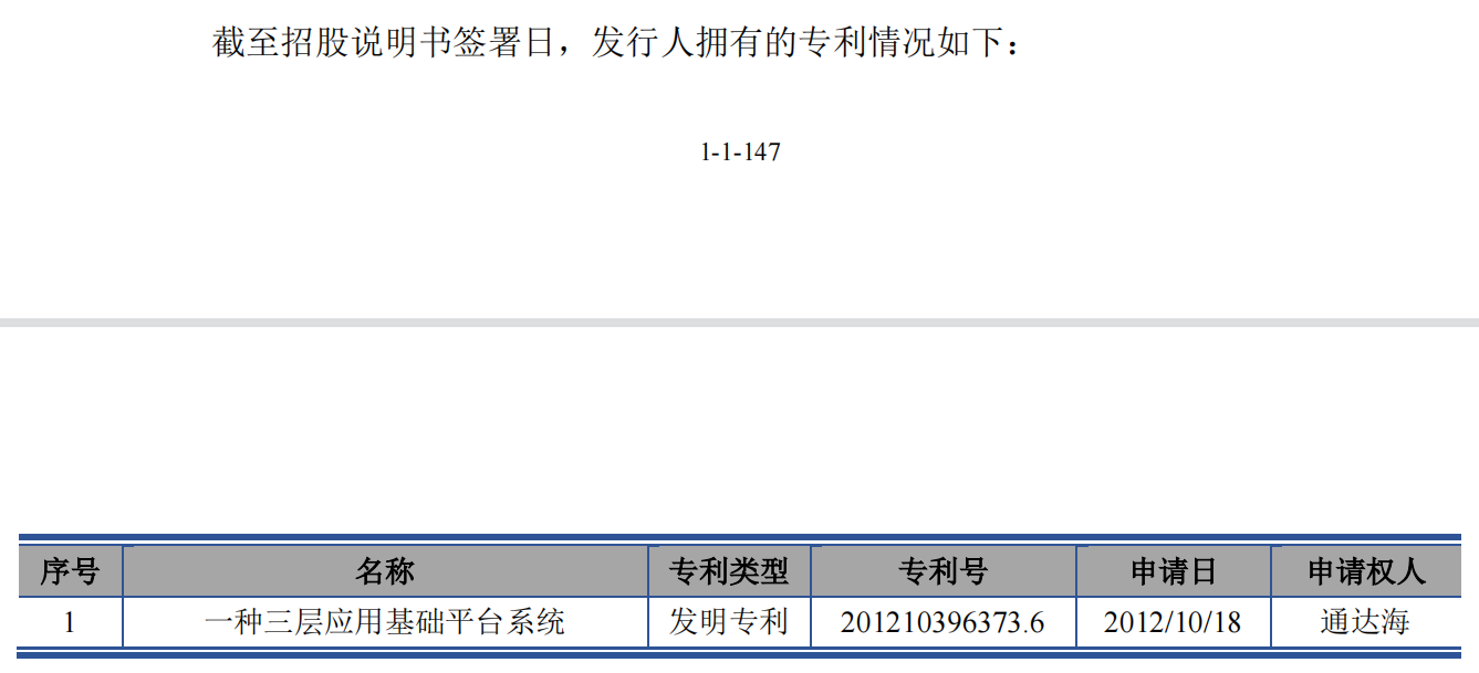 招股书显示,截至2021年6月末,通达海的专利总数及发明专利数均仅1项,申请获取时间已经在遥远的2012年10月18日。另外有软件著作权70项、软件产品证书41项。其中,2020年该公司仅新增2项软件著作权。