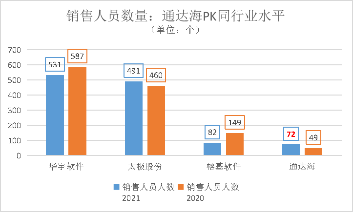 研发严重滞后,将导致公司发展后劲不足。与此同时,公司销售人员数量也不足以支撑公司拓展。华宇软件和太极股份销售人员数量在490人至530人之间。通达海的人数仅是前两者15%左右。