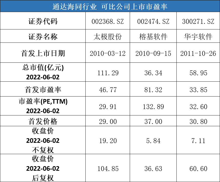 从过去看,3家同行业公司多是在2002至2011年之间上市,彼时首发市盈率在33倍到87倍之间。当前3家公司市盈率多在30倍左右,6月2日收盘价在5.84元/股至19.20元/股之间。