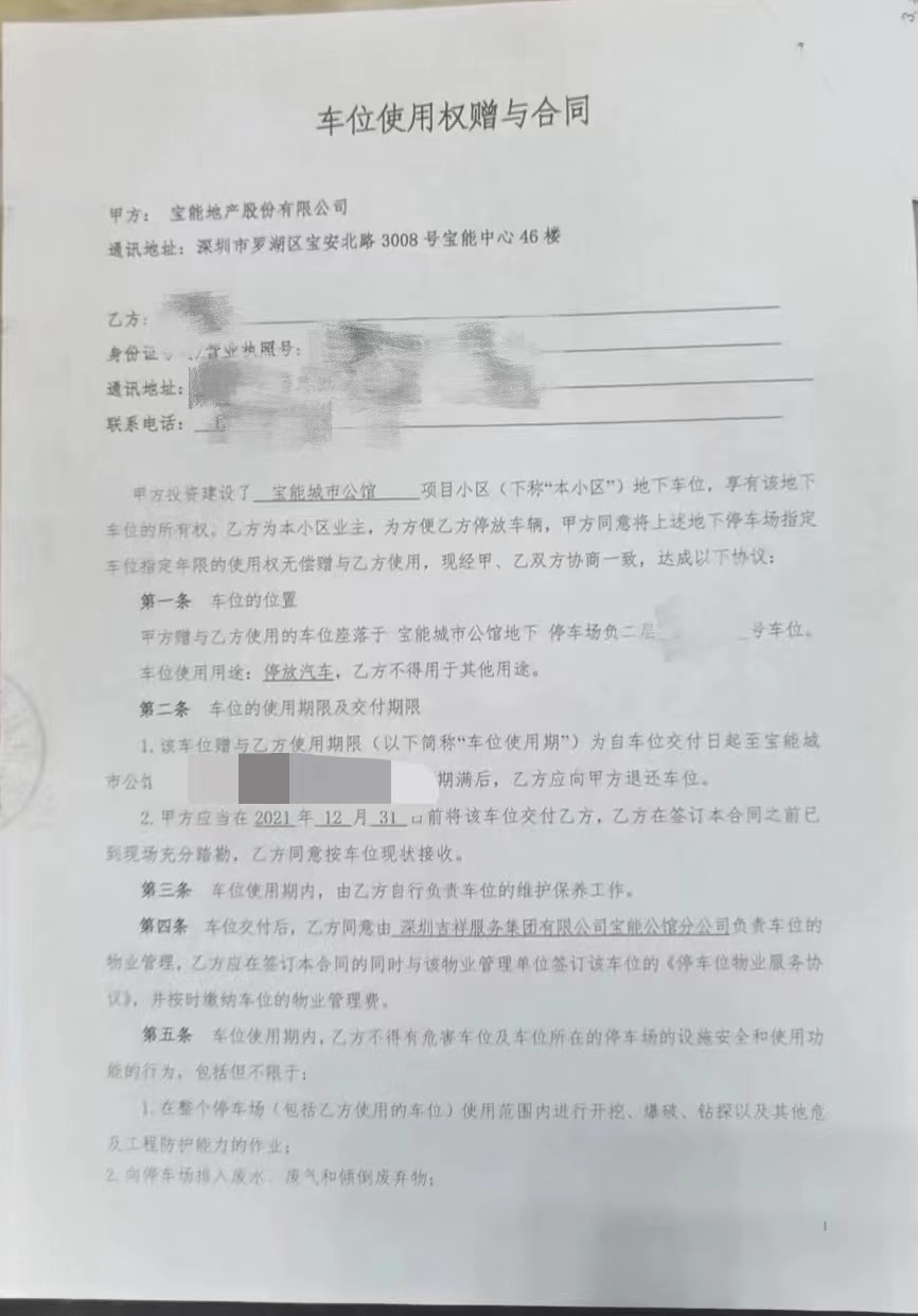宝能公馆的公寓业主出示的一份车位使用权赠与合同显示,甲方赠与乙方使用的停车位坐落于宝能城市公馆负二层,车位使用期为公寓土地使用期限期满后。