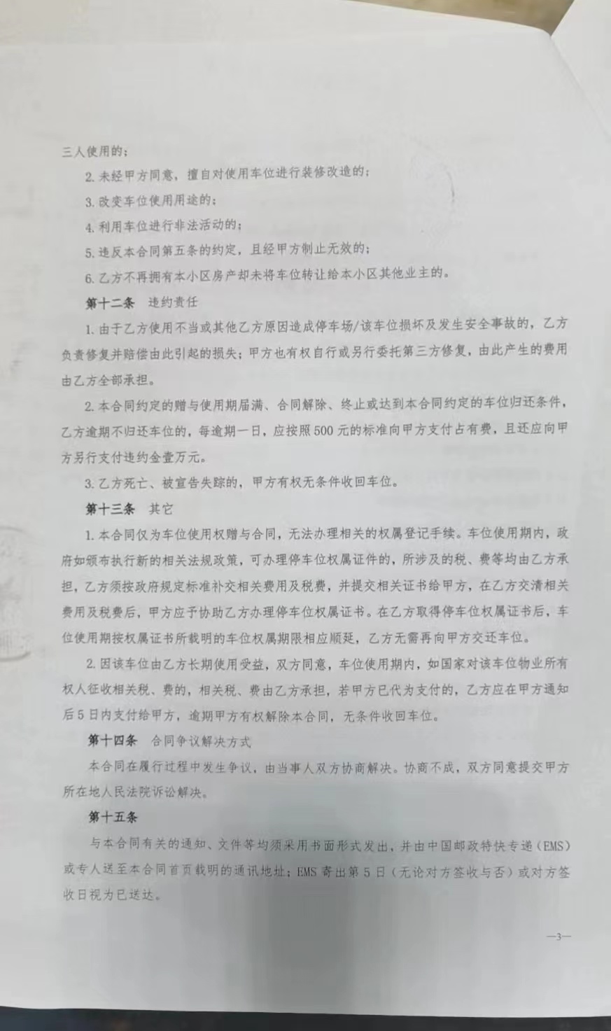 在合同最后一页,第十三条“其他”写着:本合同仅为车位使用权赠与合同,无法办理相关的权属登记手续。
