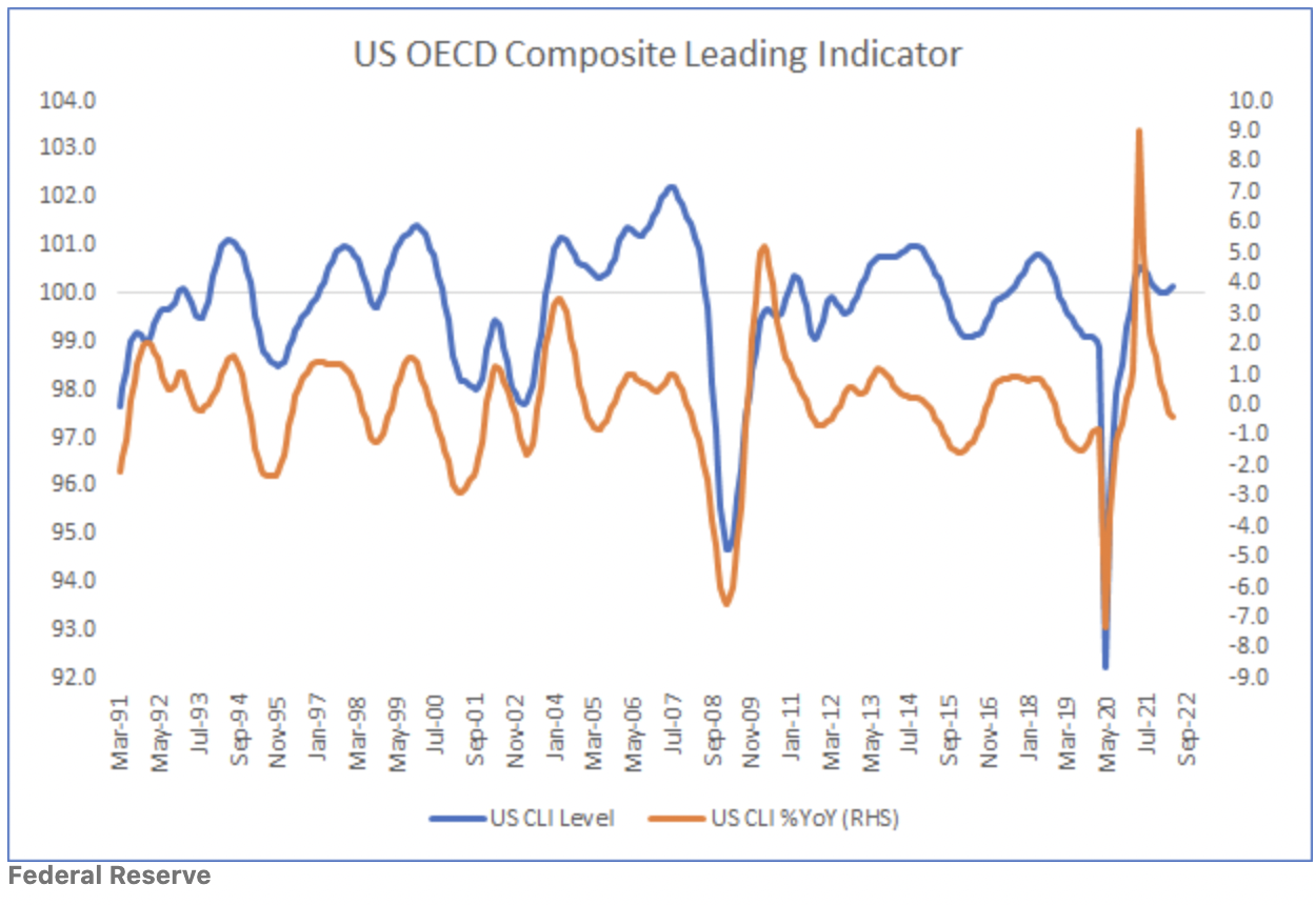 疲软的商业和消费者信心导致经济活动急剧减速,这可以从经合组织综合领先指标(CLI) 的显著放缓中看出。其中,美国CLI的水平几乎触及100(区分高于/低于趋势活动) 和同比增长率低于0%。