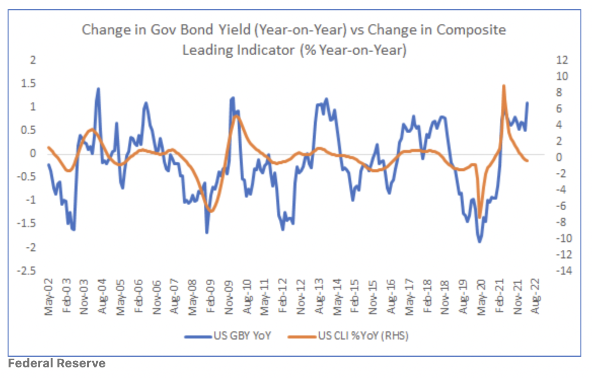 历史还表明,经合组织CLI的同比变化与政府债券收益率之间存在密切关系。目前,两者的脱钩(见下图)相当明显,美国政府债券收益率可能会在某个阶段下降,以更密切地反映经济现实。